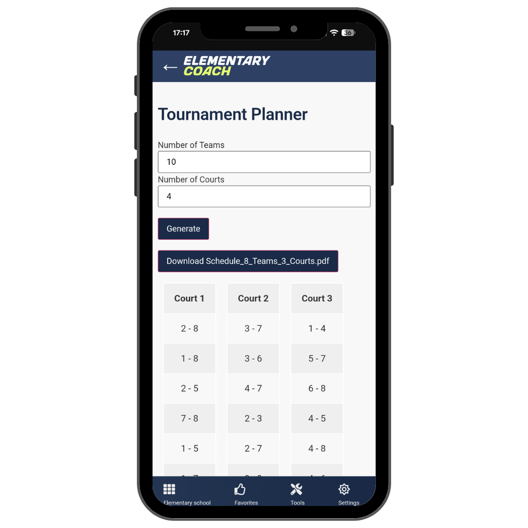 Simply enter the teams and courts, and the Tournament Planner does the rest. Perfect for PE teachers who want to plan tournaments efficiently and stress-free. Try ElementaryCoachโ€™s Tournament Planner and enjoy a seamless tournament experience!